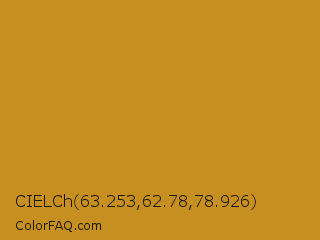 CIELCh 63.253,62.78,78.926 Color is a normal orange color and the nearest color is Nugget #c59922. Hex code #c78f20 and RGB value is rgb(199,143,32). In RGB color space, this color is composed of 78% red, 56% green, 13% blue, In CMYK color space, this color is composed of 0% cyan, 28% magenta, 84% yellow , 22% black , In HSL color space, this color has a hue angle of 40° , 72% saturation and 45% lightness.