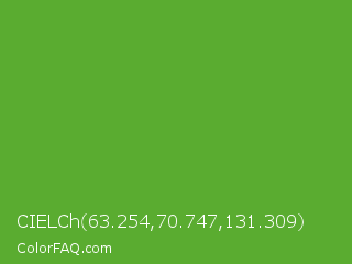 CIELCh 63.254,70.747,131.309 Color is a normal green color and the nearest color is Green RYB #66b032. Hex code #5aac30 and RGB value is rgb(90,172,48). In RGB color space, this color is composed of 35% red, 67% green, 19% blue, In CMYK color space, this color is composed of 48% cyan, 0% magenta, 72% yellow , 33% black , In HSL color space, this color has a hue angle of 100° , 56% saturation and 43% lightness.