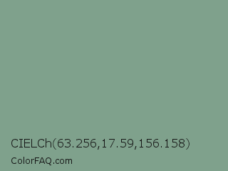 CIELCh 63.256,17.59,156.158 Color is a normal green color and the nearest color is Bay Leaf #7da98d. Hex code #7fa18c and RGB value is rgb(127,161,140). In RGB color space, this color is composed of 50% red, 63% green, 55% blue, In CMYK color space, this color is composed of 21% cyan, 0% magenta, 13% yellow , 37% black , In HSL color space, this color has a hue angle of 143° , 15% saturation and 56% lightness.