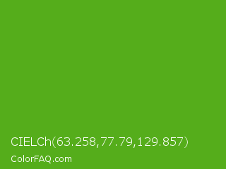 CIELCh 63.258,77.79,129.857 Color is a normal green color and the nearest color is Kelly Green #4cbb17. Hex code #55ad1b and RGB value is rgb(85,173,27). In RGB color space, this color is composed of 33% red, 68% green, 11% blue, In CMYK color space, this color is composed of 51% cyan, 0% magenta, 84% yellow , 32% black , In HSL color space, this color has a hue angle of 96° , 73% saturation and 39% lightness.