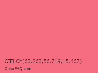 CIELCh 63.263,56.719,15.467 Color is a light red color and the nearest color is Ultra Red #fc6c85. Hex code #f66c81 and RGB value is rgb(246,108,129). In RGB color space, this color is composed of 96% red, 42% green, 51% blue, In CMYK color space, this color is composed of 0% cyan, 56% magenta, 48% yellow , 4% black , In HSL color space, this color has a hue angle of 351° , 88% saturation and 69% lightness.