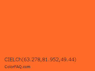 CIELCh 63.278,81.952,49.44 Color is a normal orange color and the nearest color is Orange #ff681f. Hex code #ff6b27 and RGB value is rgb(255,107,39). In RGB color space, this color is composed of 100% red, 42% green, 15% blue, In CMYK color space, this color is composed of 0% cyan, 58% magenta, 85% yellow , 0% black , In HSL color space, this color has a hue angle of 19° , 100% saturation and 58% lightness.