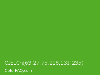 CIELCh 63.27,75.228,131.235 Color is a normal green color and the nearest color is Green RYB #66b032. Hex code #54ad26 and RGB value is rgb(84,173,38). In RGB color space, this color is composed of 33% red, 68% green, 15% blue, In CMYK color space, this color is composed of 51% cyan, 0% magenta, 78% yellow , 32% black , In HSL color space, this color has a hue angle of 100° , 64% saturation and 41% lightness.