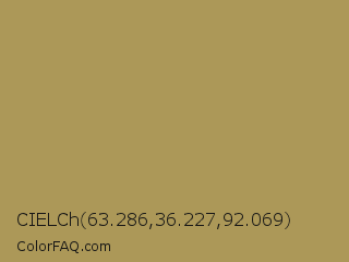 CIELCh 63.286,36.227,92.069 Color is a normal yellow color and the nearest color is Teak #b19461. Hex code #ac9858 and RGB value is rgb(172,152,88). In RGB color space, this color is composed of 67% red, 60% green, 35% blue, In CMYK color space, this color is composed of 0% cyan, 12% magenta, 49% yellow , 33% black , In HSL color space, this color has a hue angle of 46° , 34% saturation and 51% lightness.