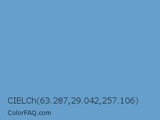 CIELCh 63.287,29.042,257.106 Color is a normal blue color and the nearest color is Blue Gray #6699cc. Hex code #669fcb and RGB value is rgb(102,159,203). In RGB color space, this color is composed of 40% red, 62% green, 80% blue, In CMYK color space, this color is composed of 50% cyan, 22% magenta, 0% yellow , 20% black , In HSL color space, this color has a hue angle of 206° , 49% saturation and 60% lightness.