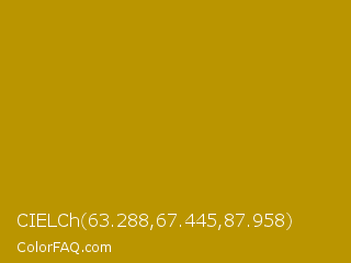 CIELCh 63.288,67.445,87.958 Color is a normal yellow color and the nearest color is Buddha Gold #c1a004. Hex code #ba9500 and RGB value is rgb(186,149,0). In RGB color space, this color is composed of 73% red, 58% green, 0% blue, In CMYK color space, this color is composed of 0% cyan, 20% magenta, 100% yellow , 27% black , In HSL color space, this color has a hue angle of 48° , 100% saturation and 36% lightness.
