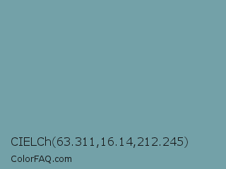 CIELCh 63.311,16.14,212.245 Color is a normal cyan color and the nearest color is Gumbo #7ca1a6. Hex code #73a1a8 and RGB value is rgb(115,161,168). In RGB color space, this color is composed of 45% red, 63% green, 66% blue, In CMYK color space, this color is composed of 32% cyan, 4% magenta, 0% yellow , 34% black , In HSL color space, this color has a hue angle of 188° , 23% saturation and 55% lightness.