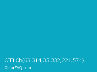 CIELCh 63.314,35.332,221.574 Color is a normal cyan color and the nearest color is Pacific Blue Crayola #009dc4. Hex code #0aa8c2 and RGB value is rgb(10,168,194). In RGB color space, this color is composed of 4% red, 66% green, 76% blue, In CMYK color space, this color is composed of 95% cyan, 13% magenta, 0% yellow , 24% black , In HSL color space, this color has a hue angle of 188° , 90% saturation and 40% lightness.