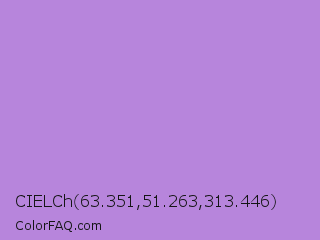 CIELCh 63.351,51.263,313.446 Color is a light purple color and the nearest color is Lavender #b57edc. Hex code #b785dc and RGB value is rgb(183,133,220). In RGB color space, this color is composed of 72% red, 52% green, 86% blue, In CMYK color space, this color is composed of 17% cyan, 40% magenta, 0% yellow , 14% black , In HSL color space, this color has a hue angle of 274° , 55% saturation and 69% lightness.