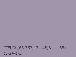 CIELCh 63.353,13.148,311.185 Color is a light purple color and the nearest color is Amethyst Smoke #a397b4. Hex code #a195ab and RGB value is rgb(161,149,171). In RGB color space, this color is composed of 63% red, 58% green, 67% blue, In CMYK color space, this color is composed of 6% cyan, 13% magenta, 0% yellow , 33% black , In HSL color space, this color has a hue angle of 273° , 12% saturation and 63% lightness.