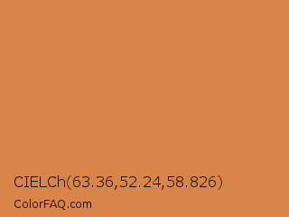CIELCh 63.36,52.24,58.826 Color is a normal orange color and the nearest color is Raw Sienna Crayola #d27d46. Hex code #d9854a and RGB value is rgb(217,133,74). In RGB color space, this color is composed of 85% red, 52% green, 29% blue, In CMYK color space, this color is composed of 0% cyan, 39% magenta, 66% yellow , 15% black , In HSL color space, this color has a hue angle of 25° , 65% saturation and 57% lightness.