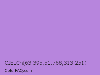 CIELCh 63.395,51.768,313.251 Color is a light purple color and the nearest color is Lavender #b57edc. Hex code #b785dd and RGB value is rgb(183,133,221). In RGB color space, this color is composed of 72% red, 52% green, 87% blue, In CMYK color space, this color is composed of 17% cyan, 40% magenta, 0% yellow , 13% black , In HSL color space, this color has a hue angle of 274° , 56% saturation and 69% lightness.