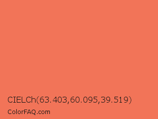 CIELCh 63.403,60.095,39.519 Color is a light red color and the nearest color is Burnt Sienna #e97451. Hex code #f27458 and RGB value is rgb(242,116,88). In RGB color space, this color is composed of 95% red, 45% green, 35% blue, In CMYK color space, this color is composed of 0% cyan, 52% magenta, 64% yellow , 5% black , In HSL color space, this color has a hue angle of 11° , 86% saturation and 65% lightness.