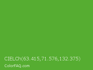CIELCh 63.415,71.576,132.375 Color is a normal green color and the nearest color is Apple #4fa83d. Hex code #56ad31 and RGB value is rgb(86,173,49). In RGB color space, this color is composed of 34% red, 68% green, 19% blue, In CMYK color space, this color is composed of 50% cyan, 0% magenta, 72% yellow , 32% black , In HSL color space, this color has a hue angle of 102° , 56% saturation and 44% lightness.