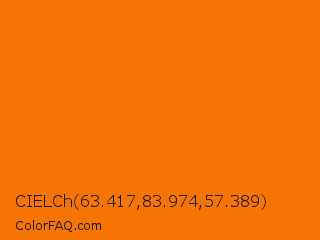 CIELCh 63.417,83.974,57.389 Color is a normal orange color and the nearest color is Chilean Fire #f77703. Hex code #f67403 and RGB value is rgb(246,116,3). In RGB color space, this color is composed of 96% red, 45% green, 1% blue, In CMYK color space, this color is composed of 0% cyan, 53% magenta, 99% yellow , 4% black , In HSL color space, this color has a hue angle of 28° , 98% saturation and 49% lightness.
