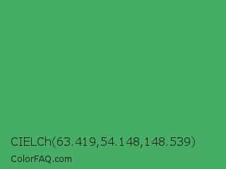 CIELCh 63.419,54.148,148.539 Color is a normal green color and the nearest color is Chateau Green #40a860. Hex code #45ad65 and RGB value is rgb(69,173,101). In RGB color space, this color is composed of 27% red, 68% green, 40% blue, In CMYK color space, this color is composed of 60% cyan, 0% magenta, 42% yellow , 32% black , In HSL color space, this color has a hue angle of 138° , 43% saturation and 47% lightness.