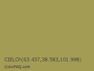 CIELCh 63.437,38.583,101.998 Color is a normal yellow color and the nearest color is Barley Corn #a68b5b. Hex code #a29c55 and RGB value is rgb(162,156,85). In RGB color space, this color is composed of 64% red, 61% green, 33% blue, In CMYK color space, this color is composed of 0% cyan, 4% magenta, 48% yellow , 36% black , In HSL color space, this color has a hue angle of 55° , 31% saturation and 48% lightness.