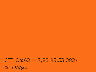 CIELCh 63.447,83.95,53.383 Color is a normal orange color and the nearest color is Pumpkin #ff7518. Hex code #fc6f17 and RGB value is rgb(252,111,23). In RGB color space, this color is composed of 99% red, 44% green, 9% blue, In CMYK color space, this color is composed of 0% cyan, 56% magenta, 91% yellow , 1% black , In HSL color space, this color has a hue angle of 23° , 97% saturation and 54% lightness.