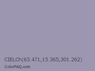CIELCh 63.471,15.365,301.262 Color is a light indigo color and the nearest color is Amethyst Smoke #a397b4. Hex code #9d96b1 and RGB value is rgb(157,150,177). In RGB color space, this color is composed of 62% red, 59% green, 69% blue, In CMYK color space, this color is composed of 11% cyan, 15% magenta, 0% yellow , 31% black , In HSL color space, this color has a hue angle of 256° , 15% saturation and 64% lightness.