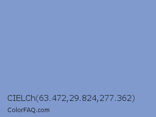CIELCh 63.472,29.824,277.362 Color is a light blue color and the nearest color is Dark Pastel Blue #779ecb. Hex code #809ace and RGB value is rgb(128,154,206). In RGB color space, this color is composed of 50% red, 60% green, 81% blue, In CMYK color space, this color is composed of 38% cyan, 25% magenta, 0% yellow , 19% black , In HSL color space, this color has a hue angle of 220° , 44% saturation and 65% lightness.