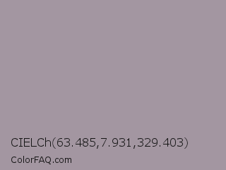 CIELCh 63.485,7.931,329.403 Color is a light magenta color and the nearest color is Dusty Gray #a8989b. Hex code #a396a1 and RGB value is rgb(163,150,161). In RGB color space, this color is composed of 64% red, 59% green, 63% blue, In CMYK color space, this color is composed of 0% cyan, 8% magenta, 1% yellow , 36% black , In HSL color space, this color has a hue angle of 309° , 7% saturation and 61% lightness.