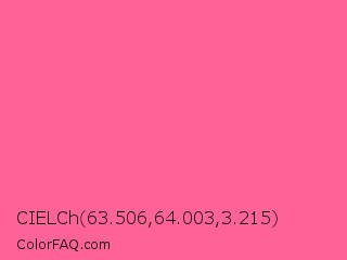 CIELCh 63.506,64.003,3.215 Color is a light rose color and the nearest color is Strawberry #fc5a8d. Hex code #ff6296 and RGB value is rgb(255,98,150). In RGB color space, this color is composed of 100% red, 38% green, 59% blue, In CMYK color space, this color is composed of 0% cyan, 62% magenta, 41% yellow , 0% black , In HSL color space, this color has a hue angle of 340° , 100% saturation and 69% lightness.