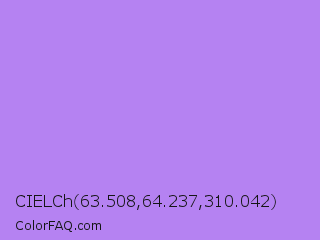 CIELCh 63.508,64.237,310.042 Color is a light violet color and the nearest color is Lavender #b57edc. Hex code #b582f2 and RGB value is rgb(181,130,242). In RGB color space, this color is composed of 71% red, 51% green, 95% blue, In CMYK color space, this color is composed of 25% cyan, 46% magenta, 0% yellow , 5% black , In HSL color space, this color has a hue angle of 267° , 81% saturation and 73% lightness.