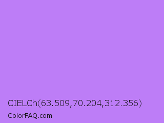 CIELCh 63.509,70.204,312.356 Color is a light purple color and the nearest color is Lavender #b57edc. Hex code #bd7df7 and RGB value is rgb(189,125,247). In RGB color space, this color is composed of 74% red, 49% green, 97% blue, In CMYK color space, this color is composed of 23% cyan, 49% magenta, 0% yellow , 3% black , In HSL color space, this color has a hue angle of 271° , 88% saturation and 73% lightness.