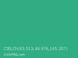 CIELCh 63.513,44.976,165.207 Color is a normal green color and the nearest color is Jungle Green #29ab87. Hex code #31ad84 and RGB value is rgb(49,173,132). In RGB color space, this color is composed of 19% red, 68% green, 52% blue, In CMYK color space, this color is composed of 72% cyan, 0% magenta, 24% yellow , 32% black , In HSL color space, this color has a hue angle of 160° , 56% saturation and 44% lightness.