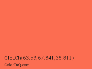 CIELCh 63.53,67.841,38.811 Color is a light red color and the nearest color is Persimmon #ff6b53. Hex code #fc6d51 and RGB value is rgb(252,109,81). In RGB color space, this color is composed of 99% red, 43% green, 32% blue, In CMYK color space, this color is composed of 0% cyan, 57% magenta, 68% yellow , 1% black , In HSL color space, this color has a hue angle of 10° , 97% saturation and 65% lightness.