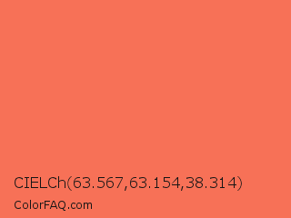 CIELCh 63.567,63.154,38.314 Color is a light red color and the nearest color is Bittersweet #fe6f5e. Hex code #f77157 and RGB value is rgb(247,113,87). In RGB color space, this color is composed of 97% red, 44% green, 34% blue, In CMYK color space, this color is composed of 0% cyan, 54% magenta, 65% yellow , 3% black , In HSL color space, this color has a hue angle of 10° , 91% saturation and 65% lightness.