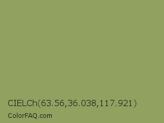 CIELCh 63.56,36.038,117.921 Color is a normal lime color and the nearest color is Moss Green #8a9a5b. Hex code #90a160 and RGB value is rgb(144,161,96). In RGB color space, this color is composed of 56% red, 63% green, 38% blue, In CMYK color space, this color is composed of 11% cyan, 0% magenta, 40% yellow , 37% black , In HSL color space, this color has a hue angle of 76° , 26% saturation and 50% lightness.