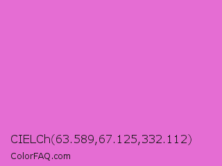CIELCh 63.589,67.125,332.112 Color is a light magenta color and the nearest color is Orchid #da70d6. Hex code #e56dd3 and RGB value is rgb(229,109,211). In RGB color space, this color is composed of 90% red, 43% green, 83% blue, In CMYK color space, this color is composed of 0% cyan, 52% magenta, 8% yellow , 10% black , In HSL color space, this color has a hue angle of 309° , 70% saturation and 66% lightness.