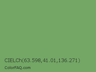 CIELCh 63.598,41.01,136.271 Color is a normal green color and the nearest color is Asparagus Green #7ba05b. Hex code #74a766 and RGB value is rgb(116,167,102). In RGB color space, this color is composed of 45% red, 65% green, 40% blue, In CMYK color space, this color is composed of 31% cyan, 0% magenta, 39% yellow , 35% black , In HSL color space, this color has a hue angle of 107° , 27% saturation and 53% lightness.