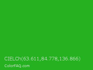 CIELCh 63.611,84.778,136.866 Color is a normal green color and the nearest color is Wageningen Green #34b233. Hex code #24b221 and RGB value is rgb(36,178,33). In RGB color space, this color is composed of 14% red, 70% green, 13% blue, In CMYK color space, this color is composed of 80% cyan, 0% magenta, 81% yellow , 30% black , In HSL color space, this color has a hue angle of 119° , 69% saturation and 41% lightness.