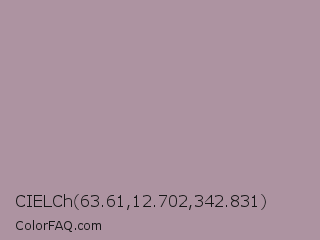 CIELCh 63.61,12.702,342.831 Color is a light rose color and the nearest color is Dusty Gray #a8989b. Hex code #ad93a1 and RGB value is rgb(173,147,161). In RGB color space, this color is composed of 68% red, 58% green, 63% blue, In CMYK color space, this color is composed of 0% cyan, 15% magenta, 7% yellow , 32% black , In HSL color space, this color has a hue angle of 328° , 14% saturation and 63% lightness.
