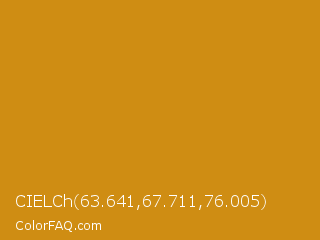 CIELCh 63.641,67.711,76.005 Color is a normal orange color and the nearest color is Geebung #d18f1b. Hex code #cf8d13 and RGB value is rgb(207,141,19). In RGB color space, this color is composed of 81% red, 55% green, 7% blue, In CMYK color space, this color is composed of 0% cyan, 32% magenta, 91% yellow , 19% black , In HSL color space, this color has a hue angle of 39° , 83% saturation and 44% lightness.