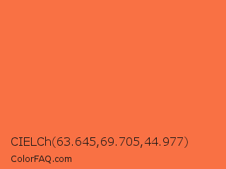 CIELCh 63.645,69.705,44.977 Color is a light color and the nearest color is Outrageous Orange #ff6e4a. Hex code #f97144 and RGB value is rgb(249,113,68). In RGB color space, this color is composed of 98% red, 44% green, 27% blue, In CMYK color space, this color is composed of 0% cyan, 55% magenta, 73% yellow , 2% black , In HSL color space, this color has a hue angle of 15° , 94% saturation and 62% lightness.