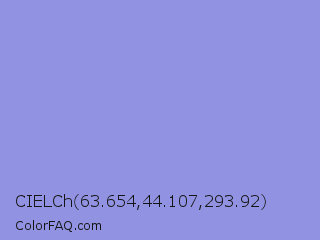 CIELCh 63.654,44.107,293.92 Color is a light blue color and the nearest color is Portage #8b9fee. Hex code #9193e2 and RGB value is rgb(145,147,226). In RGB color space, this color is composed of 57% red, 58% green, 89% blue, In CMYK color space, this color is composed of 36% cyan, 35% magenta, 0% yellow , 11% black , In HSL color space, this color has a hue angle of 239° , 58% saturation and 73% lightness.