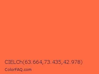 CIELCh 63.664,73.435,42.978 Color is a light red color and the nearest color is Outrageous Orange #ff6e4a. Hex code #ff6c43 and RGB value is rgb(255,108,67). In RGB color space, this color is composed of 100% red, 42% green, 26% blue, In CMYK color space, this color is composed of 0% cyan, 58% magenta, 74% yellow , 0% black , In HSL color space, this color has a hue angle of 13° , 100% saturation and 63% lightness.