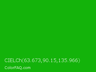 CIELCh 63.673,90.15,135.966 Color is a normal green color and the nearest color is Slimy Green #299617. Hex code #13b30a and RGB value is rgb(19,179,10). In RGB color space, this color is composed of 7% red, 70% green, 4% blue, In CMYK color space, this color is composed of 89% cyan, 0% magenta, 94% yellow , 30% black , In HSL color space, this color has a hue angle of 117° , 89% saturation and 37% lightness.
