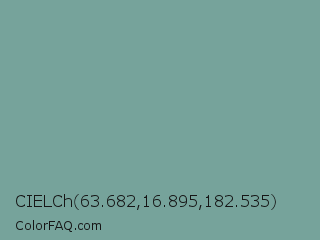 CIELCh 63.682,16.895,182.535 Color is a normal cyan color and the nearest color is Sea Nymph #78a39c. Hex code #76a39b and RGB value is rgb(118,163,155). In RGB color space, this color is composed of 46% red, 64% green, 61% blue, In CMYK color space, this color is composed of 28% cyan, 0% magenta, 5% yellow , 36% black , In HSL color space, this color has a hue angle of 169° , 20% saturation and 55% lightness.