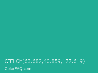 CIELCh 63.682,40.859,177.619 Color is a normal cyan color and the nearest color is Jungle Green #29ab87. Hex code #21ad96 and RGB value is rgb(33,173,150). In RGB color space, this color is composed of 13% red, 68% green, 59% blue, In CMYK color space, this color is composed of 81% cyan, 0% magenta, 13% yellow , 32% black , In HSL color space, this color has a hue angle of 170° , 68% saturation and 40% lightness.