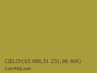 CIELCh 63.686,51.231,98.466 Color is a normal yellow color and the nearest color is Brass #b5a642. Hex code #a89c3b and RGB value is rgb(168,156,59). In RGB color space, this color is composed of 66% red, 61% green, 23% blue, In CMYK color space, this color is composed of 0% cyan, 7% magenta, 65% yellow , 34% black , In HSL color space, this color has a hue angle of 53° , 48% saturation and 45% lightness.