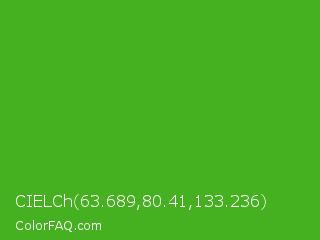 CIELCh 63.689,80.41,133.236 Color is a normal green color and the nearest color is Kelly Green #4cbb17. Hex code #45b020 and RGB value is rgb(69,176,32). In RGB color space, this color is composed of 27% red, 69% green, 13% blue, In CMYK color space, this color is composed of 61% cyan, 0% magenta, 82% yellow , 31% black , In HSL color space, this color has a hue angle of 105° , 69% saturation and 41% lightness.