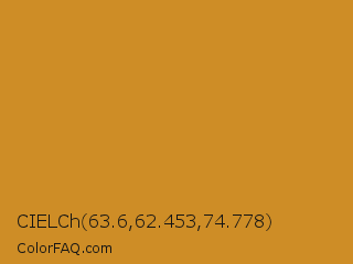 CIELCh 63.6,62.453,74.778 Color is a normal orange color and the nearest color is Brandy Punch #cd8429. Hex code #ce8d26 and RGB value is rgb(206,141,38). In RGB color space, this color is composed of 81% red, 55% green, 15% blue, In CMYK color space, this color is composed of 0% cyan, 32% magenta, 82% yellow , 19% black , In HSL color space, this color has a hue angle of 37° , 69% saturation and 48% lightness.