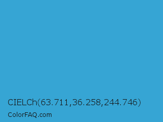 CIELCh 63.711,36.258,244.746 Color is a normal blue color and the nearest color is Maximum Blue #47abcc. Hex code #36a5d4 and RGB value is rgb(54,165,212). In RGB color space, this color is composed of 21% red, 65% green, 83% blue, In CMYK color space, this color is composed of 75% cyan, 22% magenta, 0% yellow , 17% black , In HSL color space, this color has a hue angle of 198° , 65% saturation and 52% lightness.