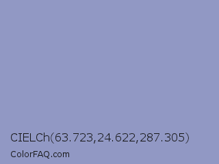 CIELCh 63.723,24.622,287.305 Color is a light blue color and the nearest color is Blue Bell Crayola #9999cc. Hex code #9198c4 and RGB value is rgb(145,152,196). In RGB color space, this color is composed of 57% red, 60% green, 77% blue, In CMYK color space, this color is composed of 26% cyan, 22% magenta, 0% yellow , 23% black , In HSL color space, this color has a hue angle of 232° , 30% saturation and 67% lightness.