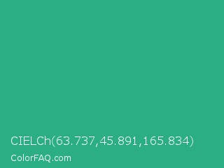 CIELCh 63.737,45.891,165.834 Color is a normal green color and the nearest color is Jungle Green #29ab87. Hex code #2bae85 and RGB value is rgb(43,174,133). In RGB color space, this color is composed of 17% red, 68% green, 52% blue, In CMYK color space, this color is composed of 75% cyan, 0% magenta, 24% yellow , 32% black , In HSL color space, this color has a hue angle of 161° , 60% saturation and 43% lightness.