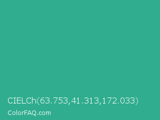 CIELCh 63.753,41.313,172.033 Color is a normal cyan color and the nearest color is Jungle Green #29ab87. Hex code #30ad8f and RGB value is rgb(48,173,143). In RGB color space, this color is composed of 19% red, 68% green, 56% blue, In CMYK color space, this color is composed of 72% cyan, 0% magenta, 17% yellow , 32% black , In HSL color space, this color has a hue angle of 166° , 57% saturation and 43% lightness.